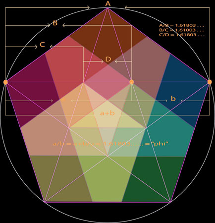 Similarly, within the pentagram the Golden Ratio is evident throughout its entire structure, as also shown in the diagram to the left: